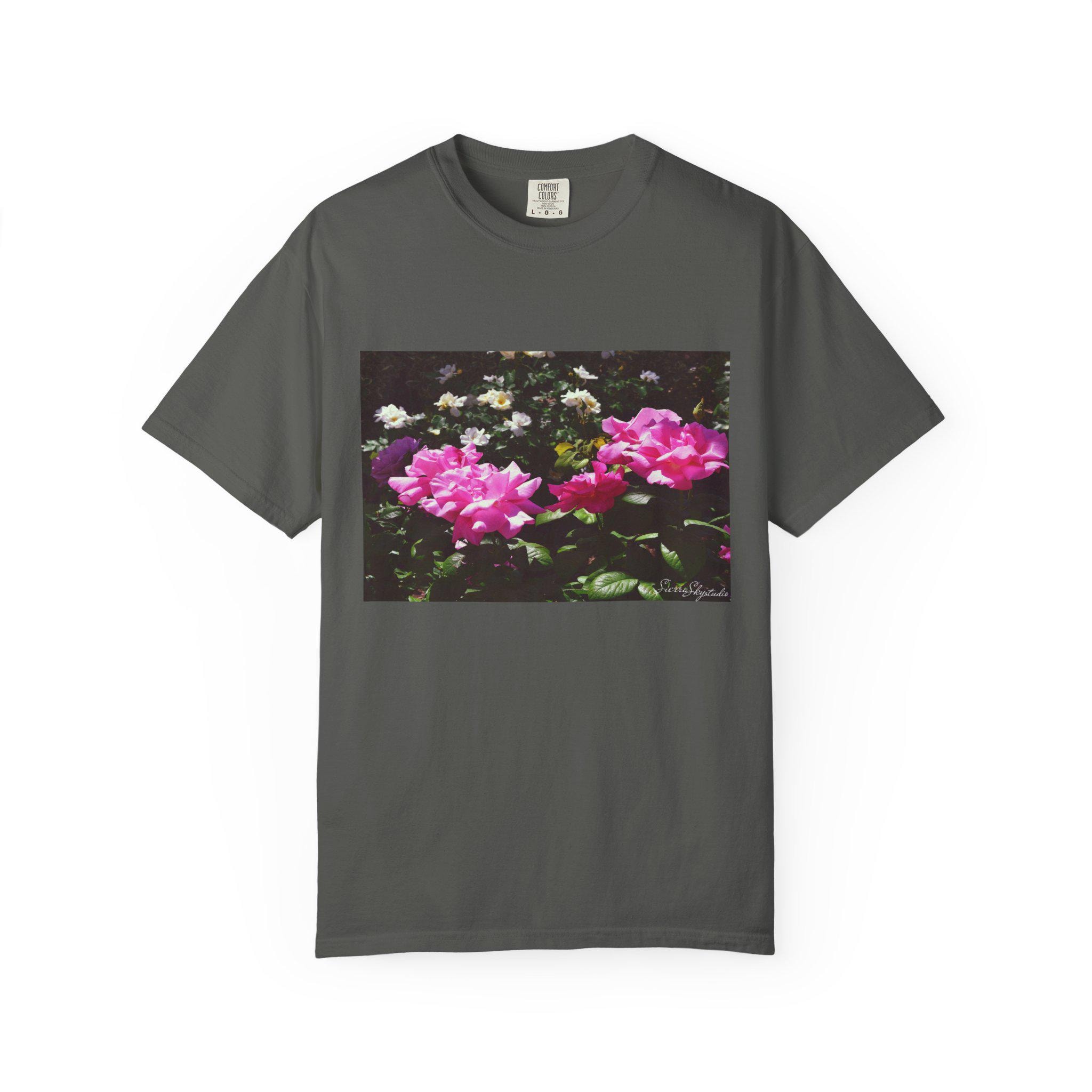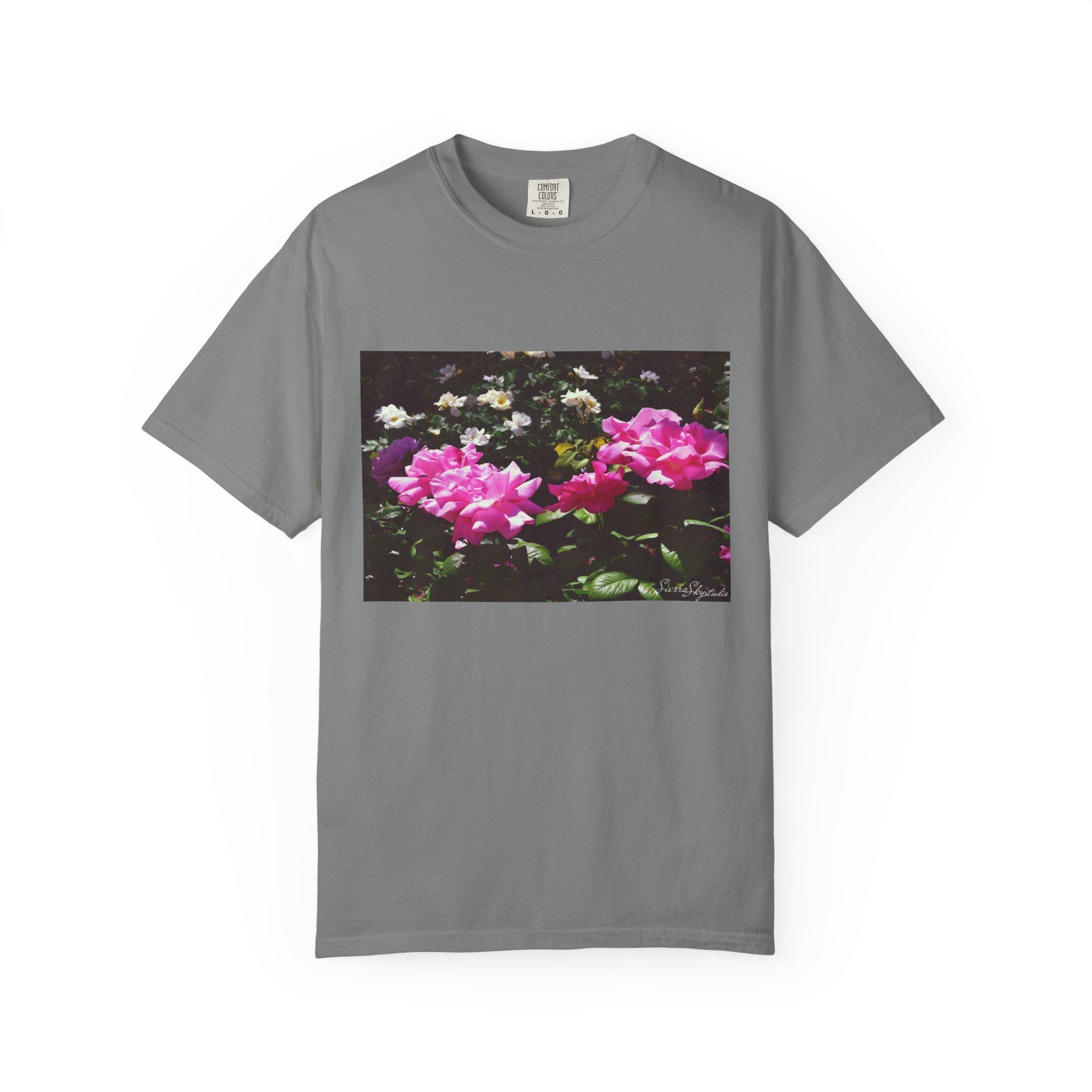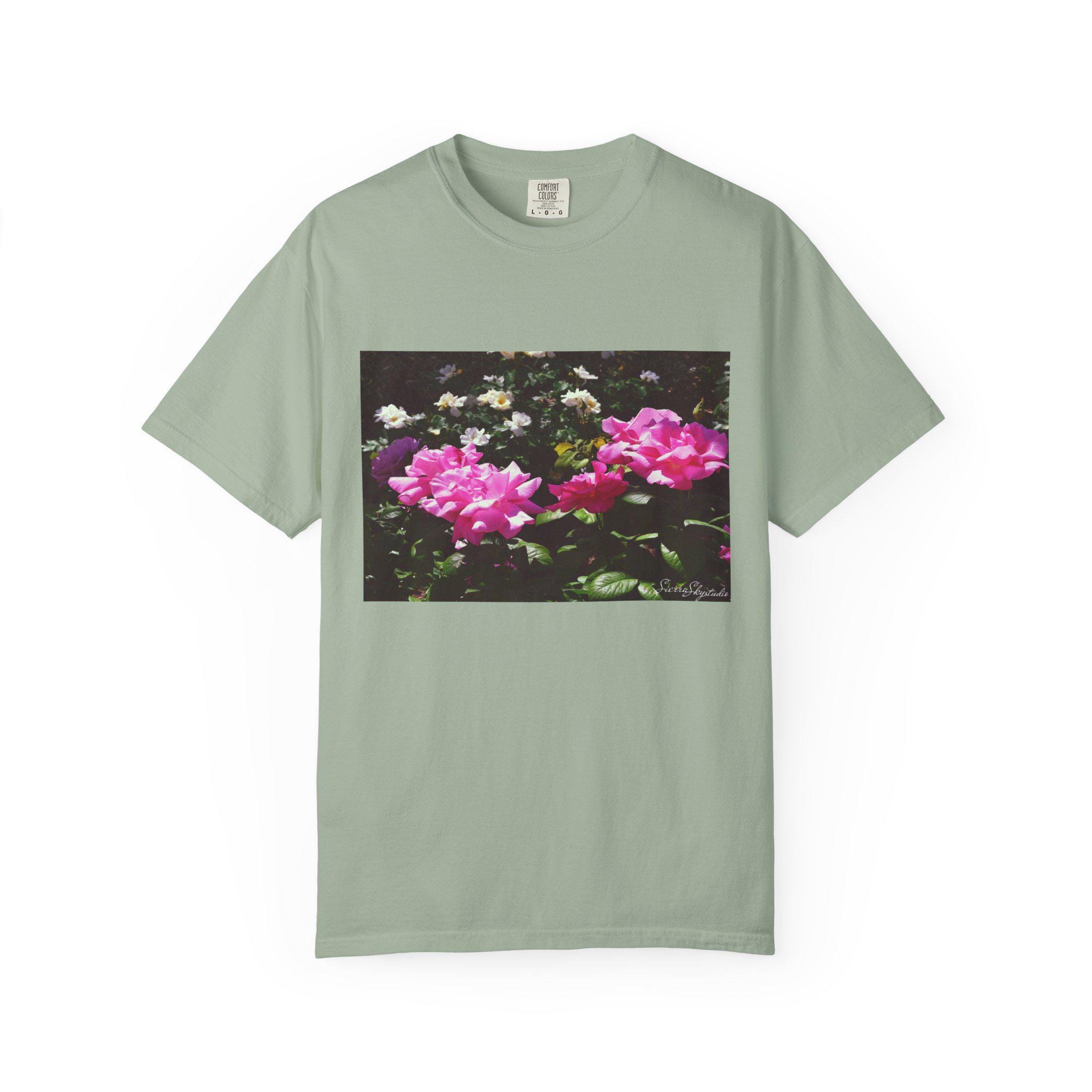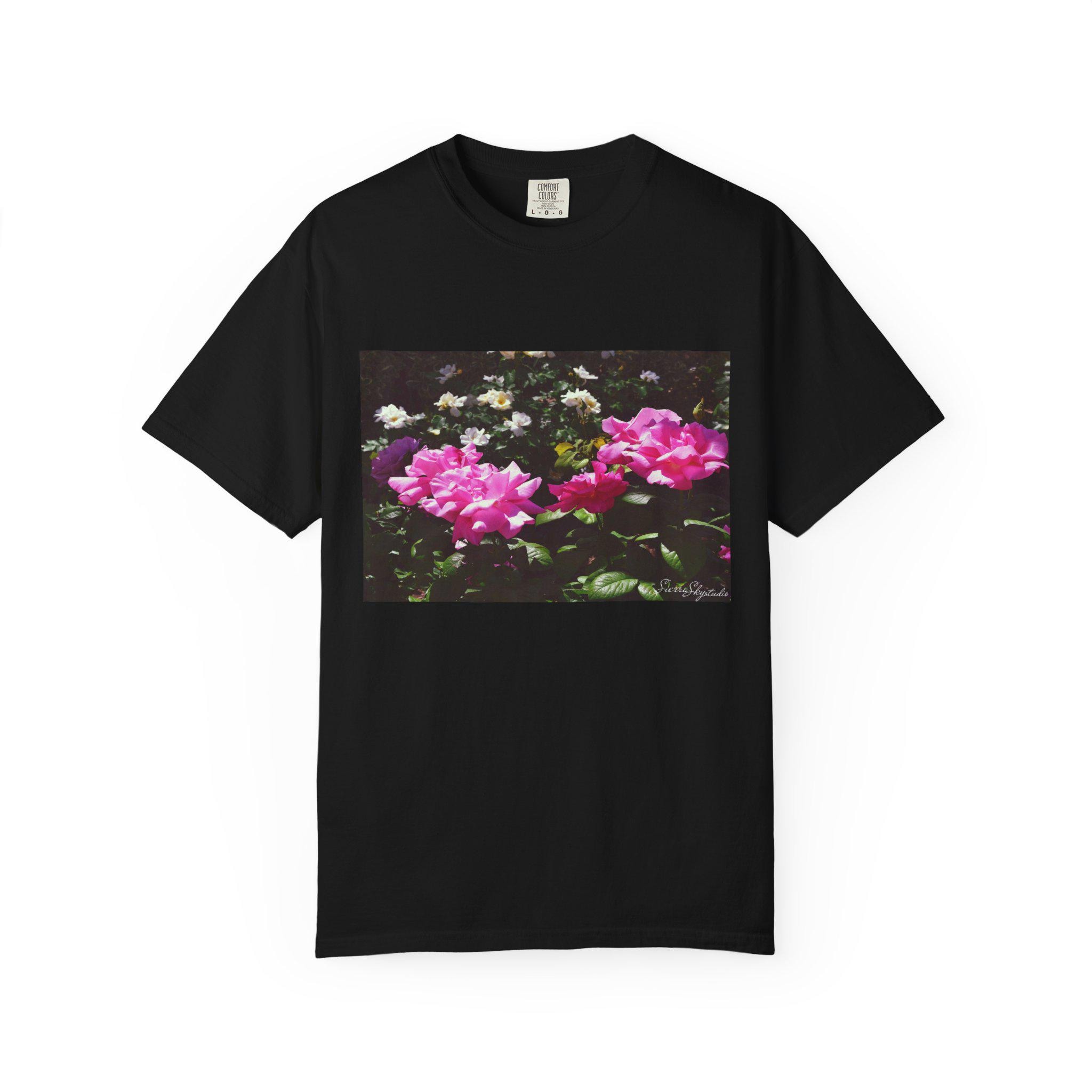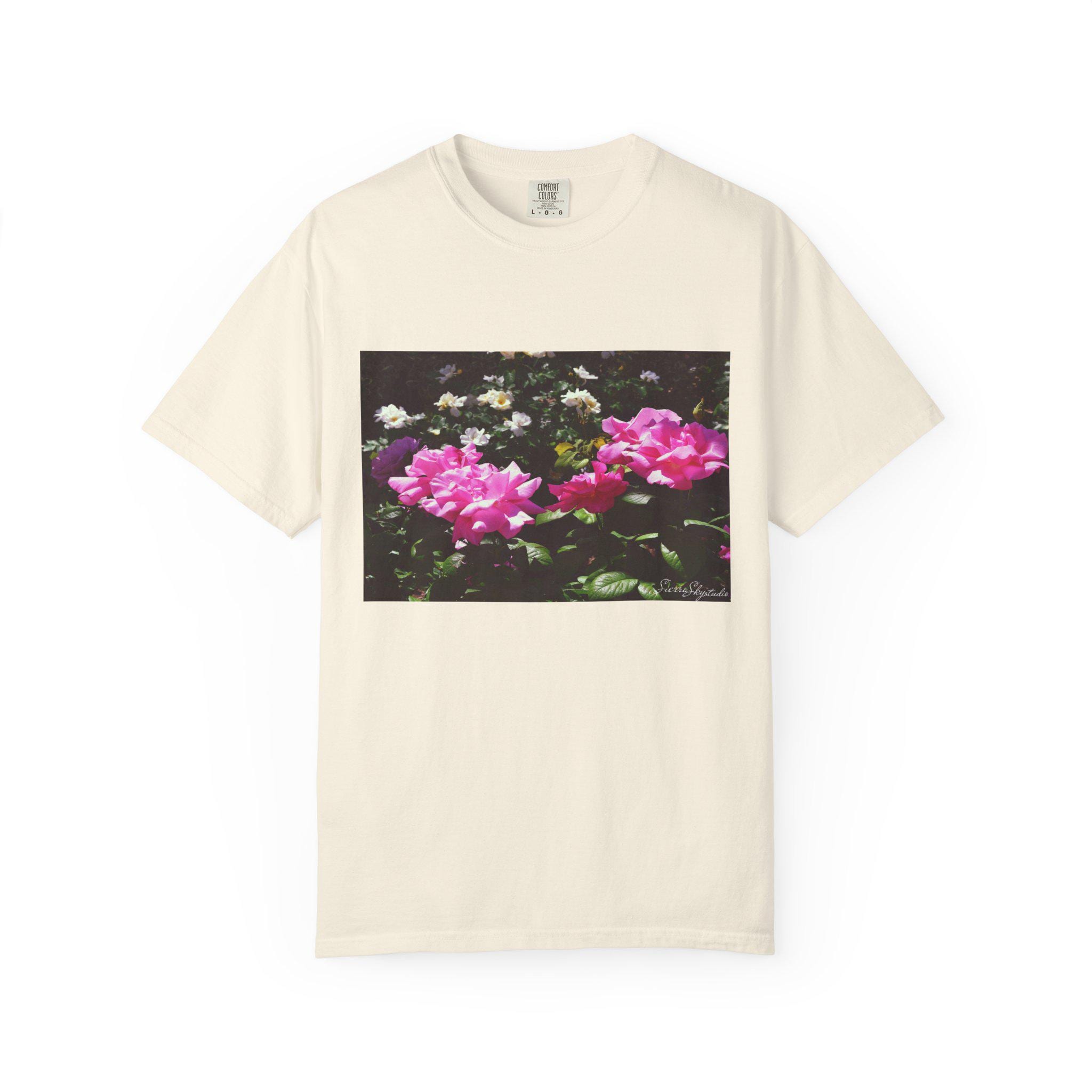 Soft, relaxed, and quietly nostalgic — this garment-dyed tee brings a sunlit garden to your everyday wardrobe. The front carries a photographic print of blooming pink roses and small white wildflowers, framed like a memory snapped during a slow afternoon stroll. The heavyweight, ring-spun cotton feels substantial yet broken-in thanks to the post-construction dyeing, so the color and texture sit softly against skin. Wear it with faded denim and a beat-up tote to lean into the laid-back, slightly vintage vibe. It settles into your rotation and keeps showing up for weekends at the farmer’s market, slow coffee dates, and backyard gatherings where conversation moves at the same unhurried pace as the clouds.