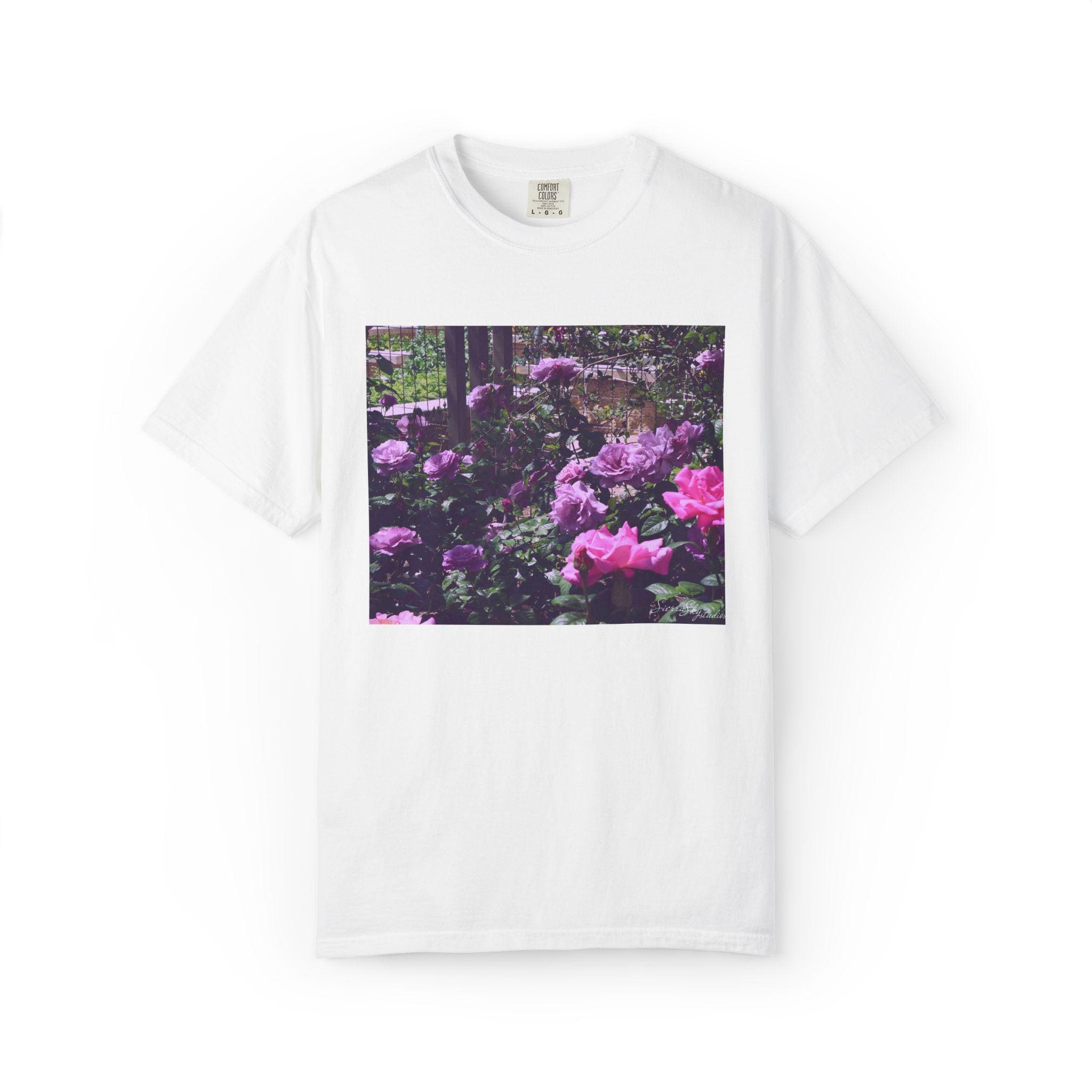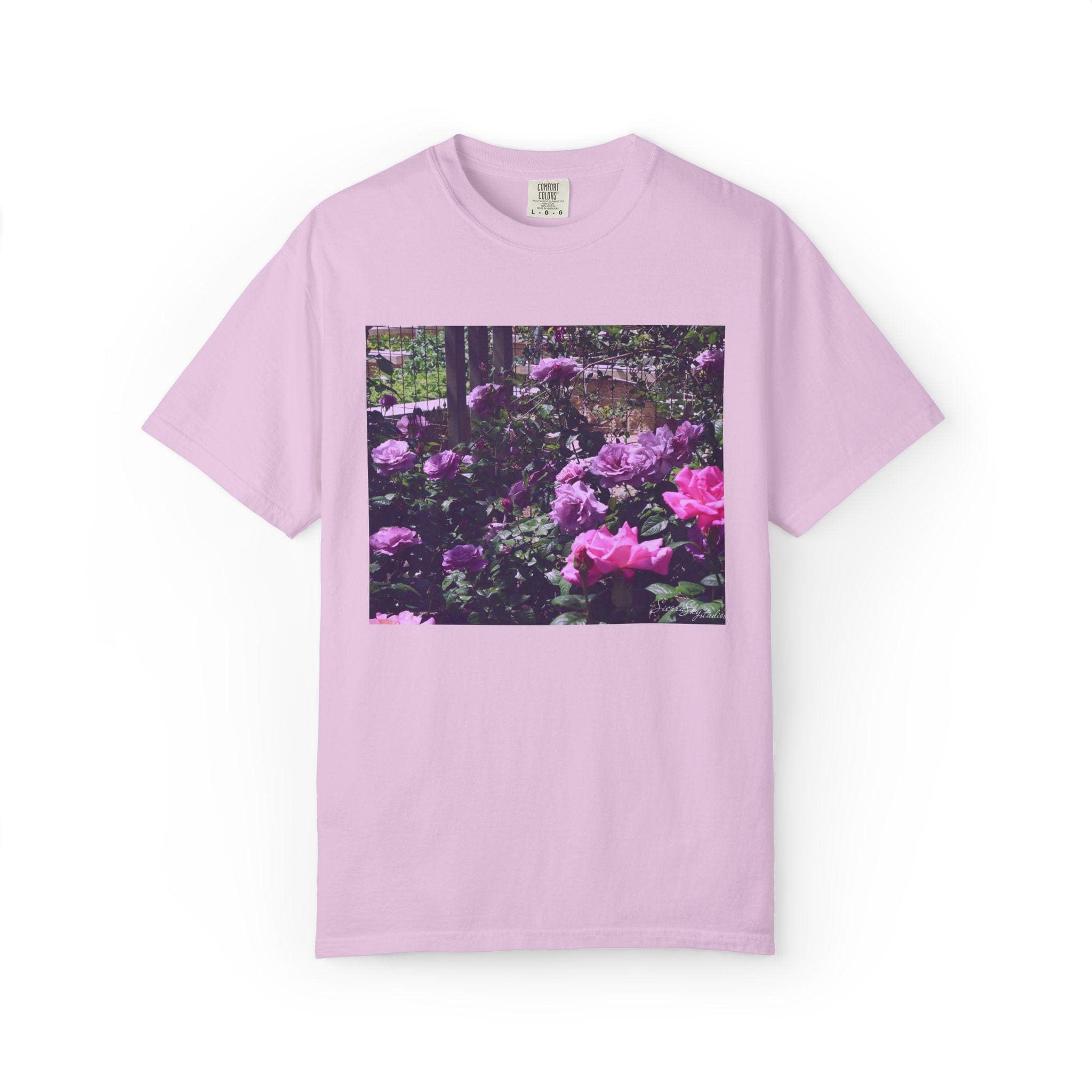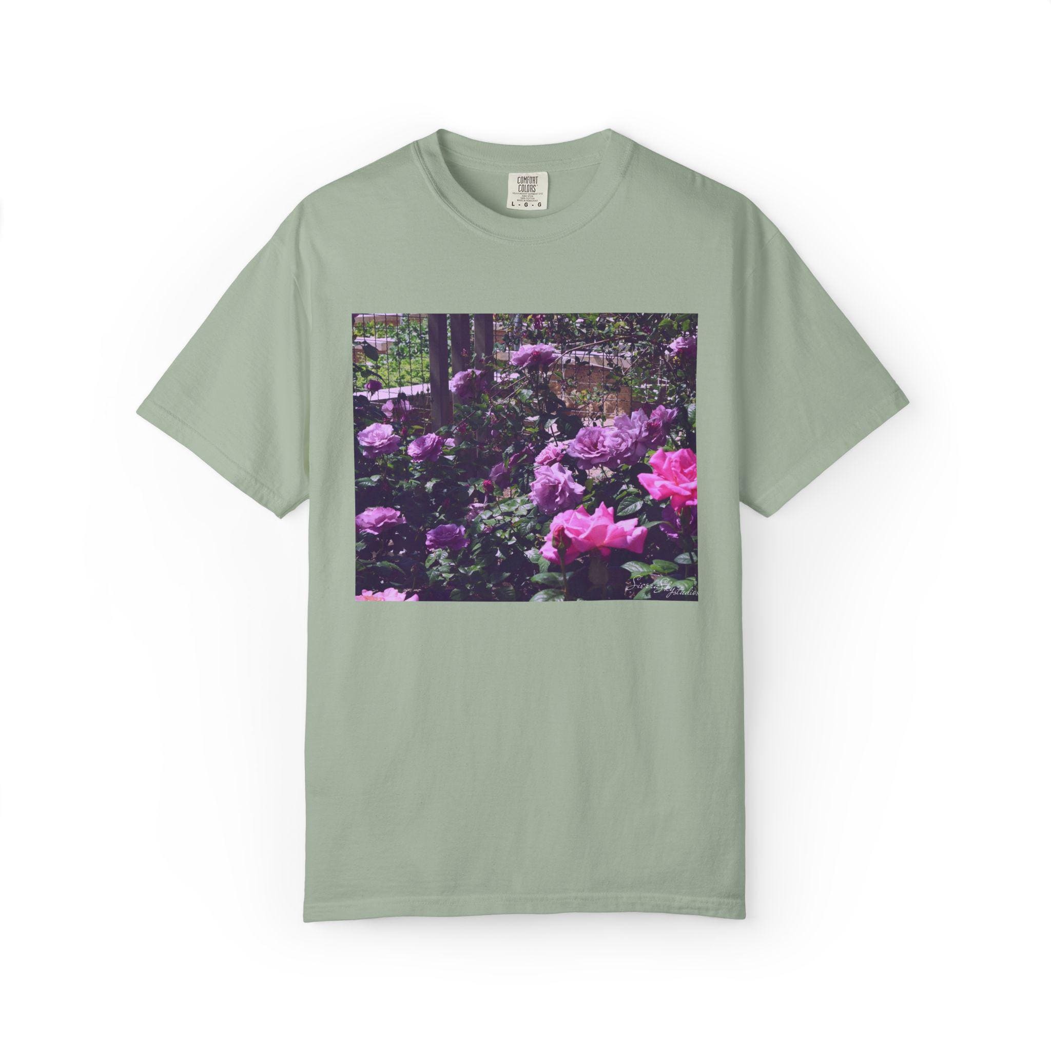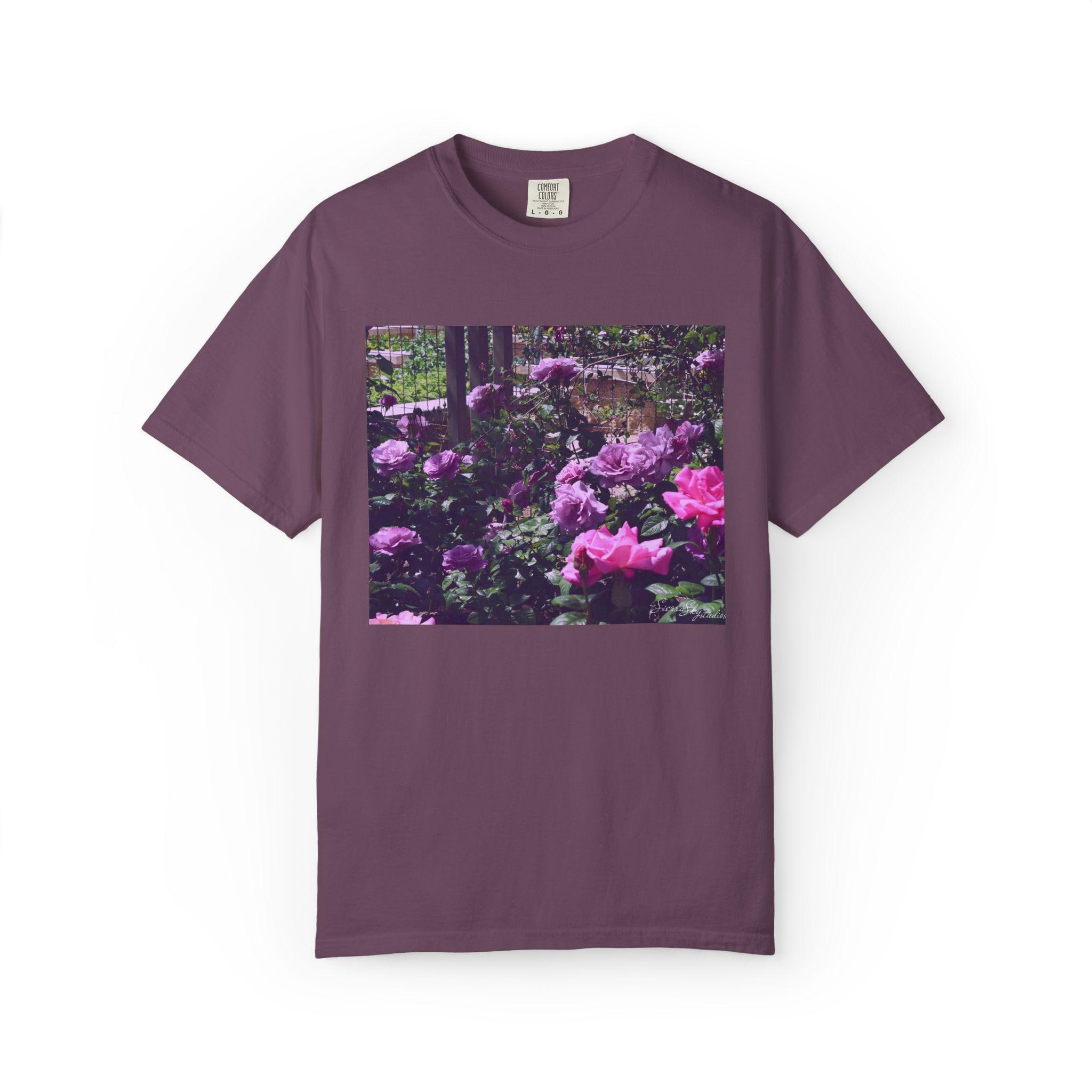 This relaxed-fit T-shirt carries a quiet, garden-moment energy — soft garment-dyed cotton with a vintage floral print that reads like a memory of an overgrown rose border at dusk. The heavyweight fabric and tubular knit sit substantial on the body while the garment-dye process gives the shirt a worn-in hand and muted color that complements the moody purples and pinks of the print. Wear it on slow mornings with a coffee, layered under a denim jacket for neighborhood walks, or to low-key gatherings where comfort and subtle style matter. The image feels nostalgic and alive: dew on petals, shaded paths, and a calm, floral hush that invites you to breathe and linger.