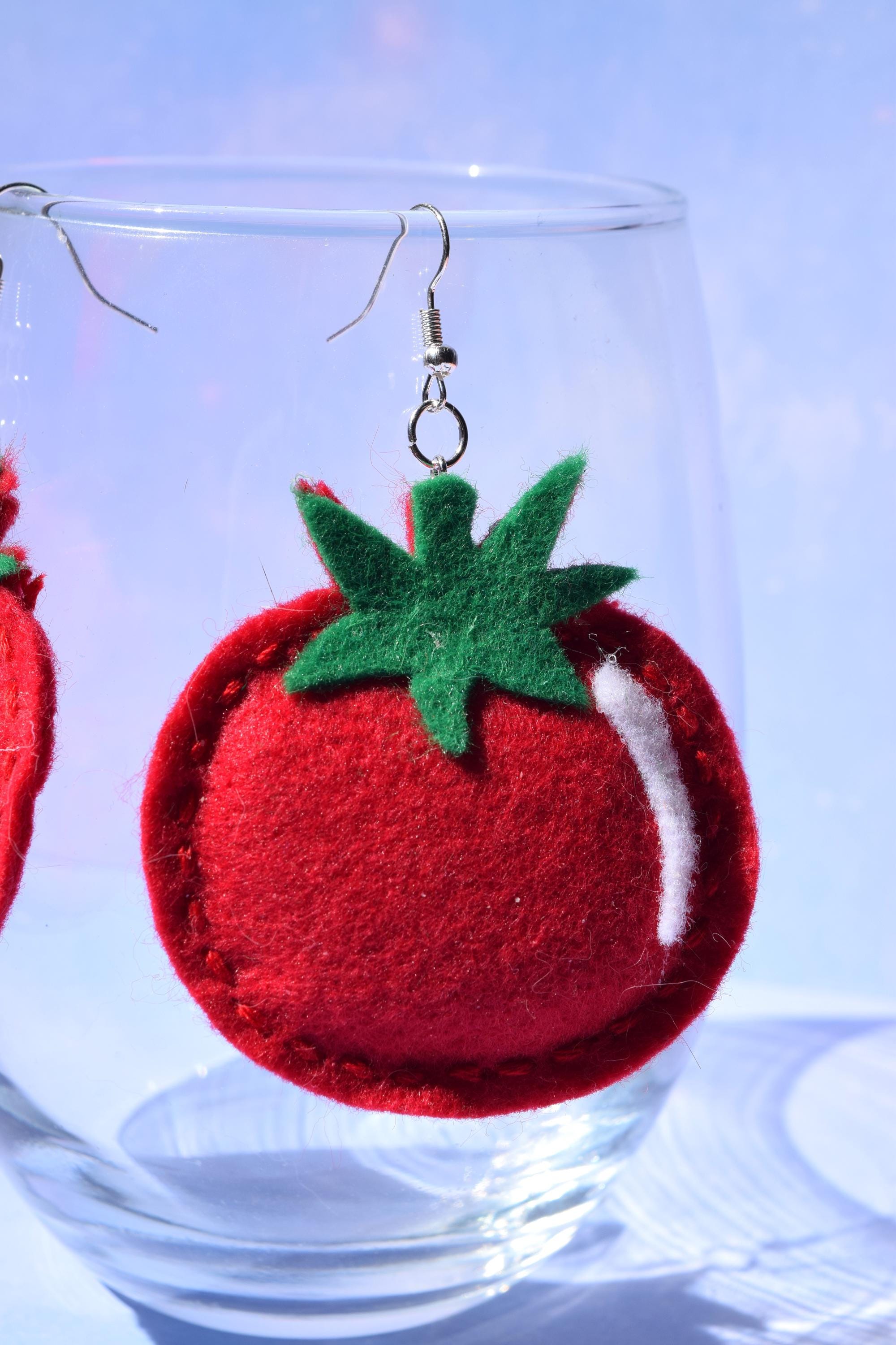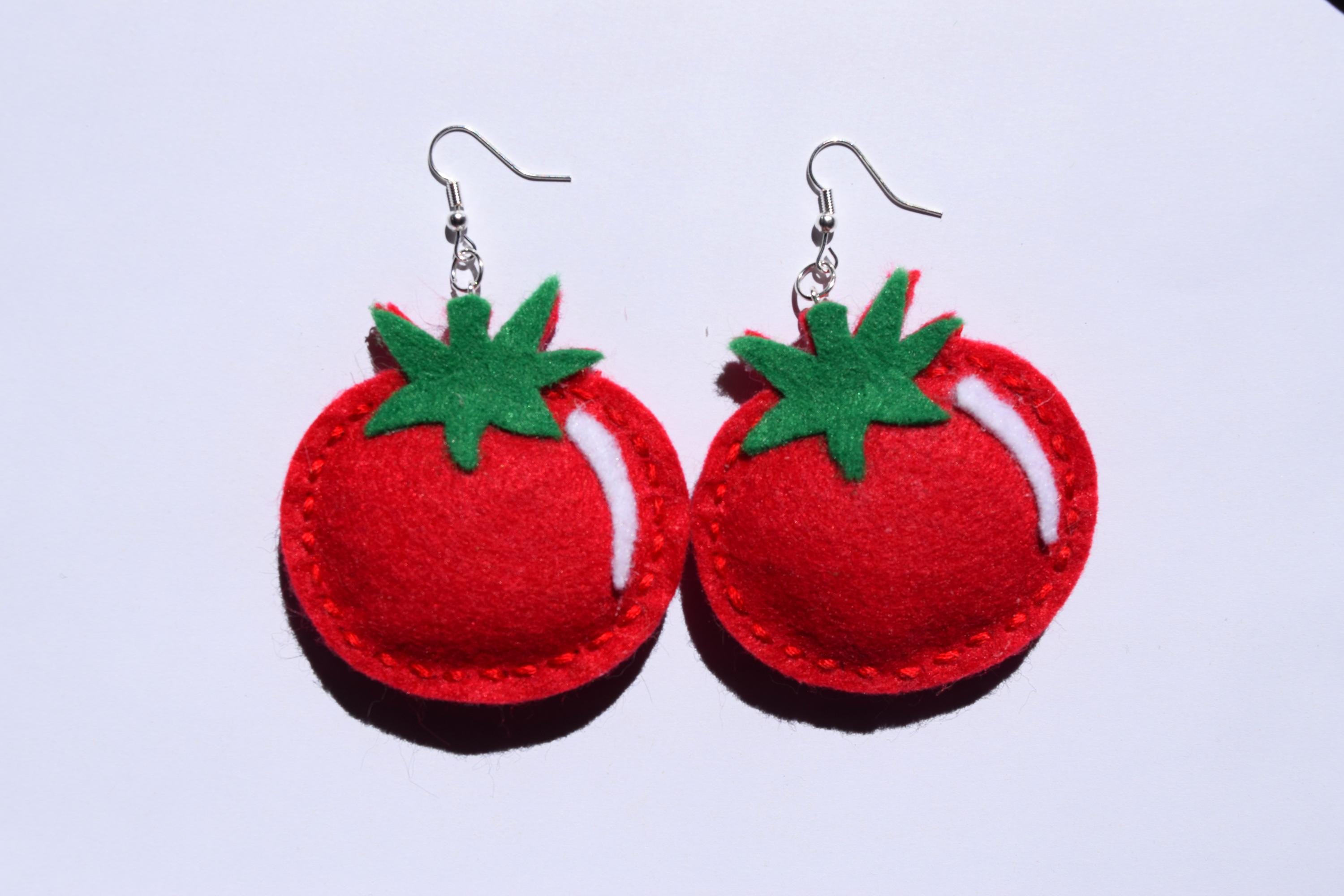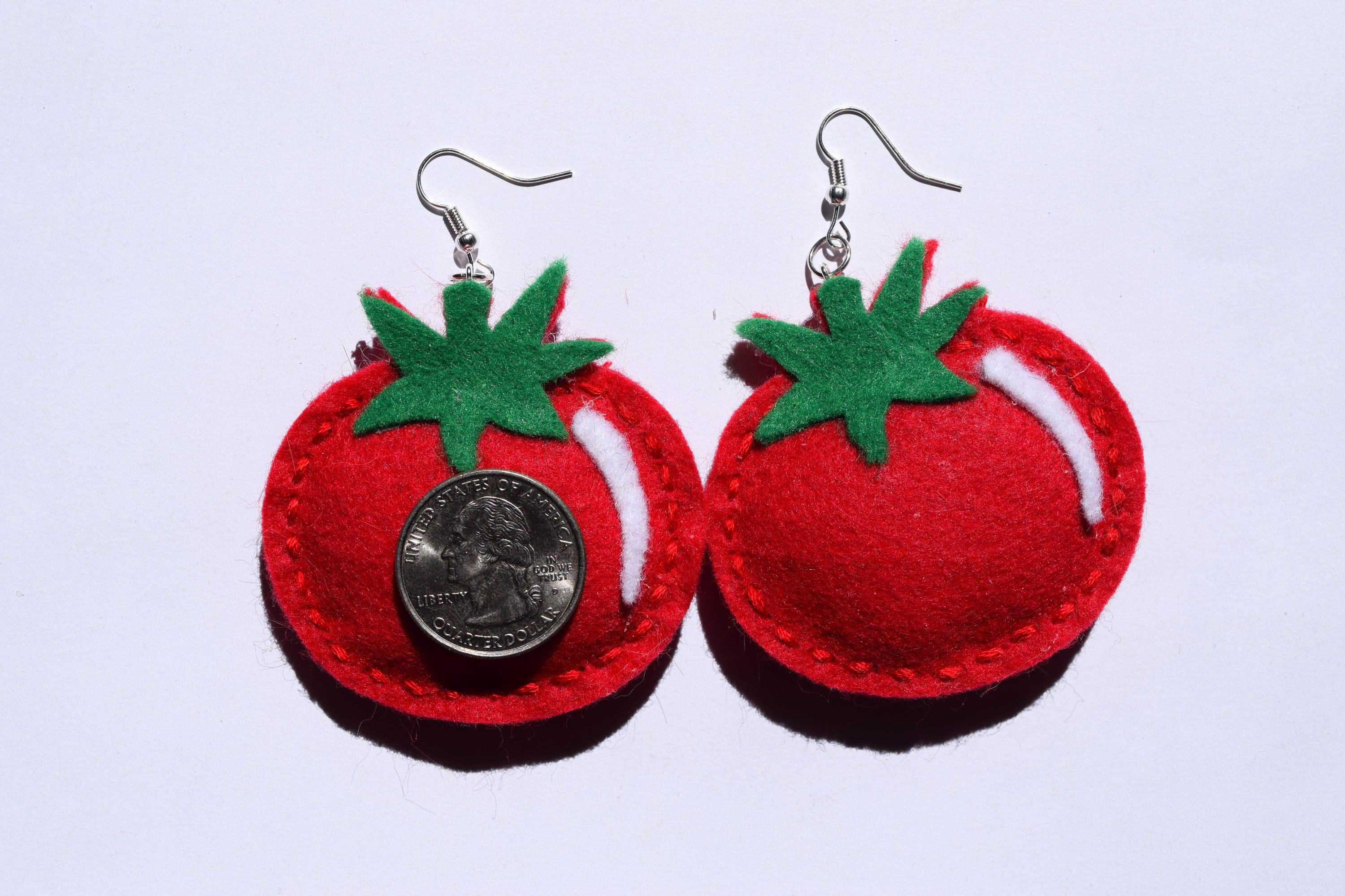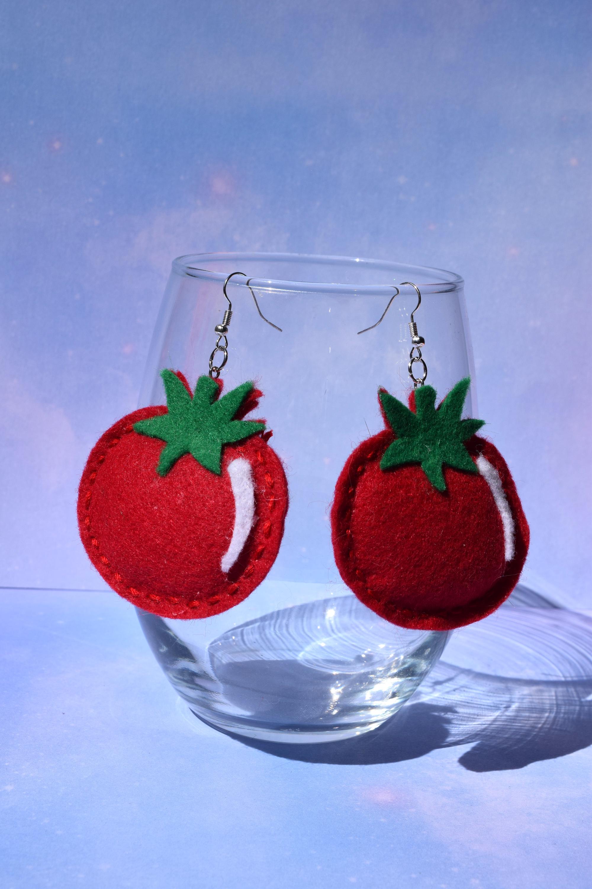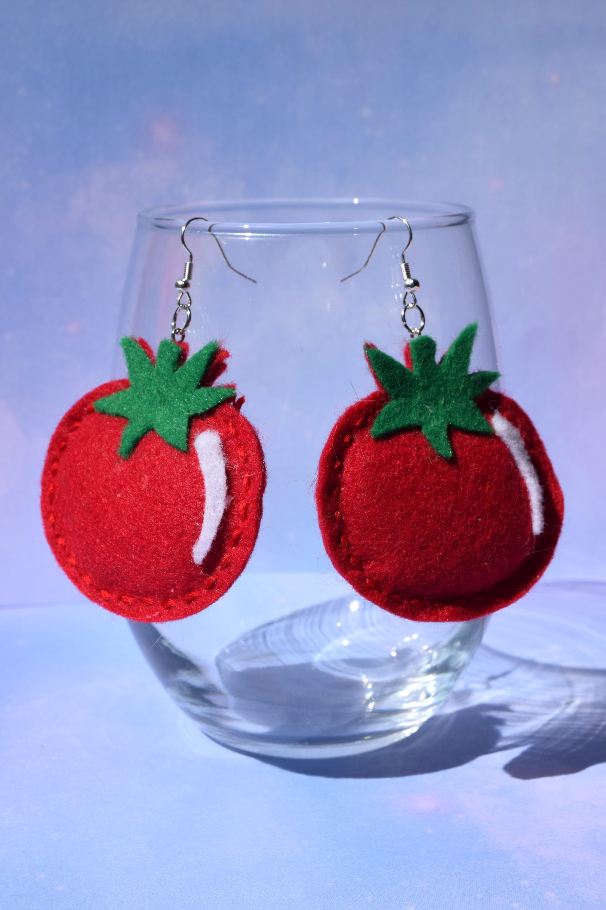 These adorable, plump tomato felt earrings were made by me, Sierra Miller. *Note: These earrings are handmade, so they may look different from the picture above.*
